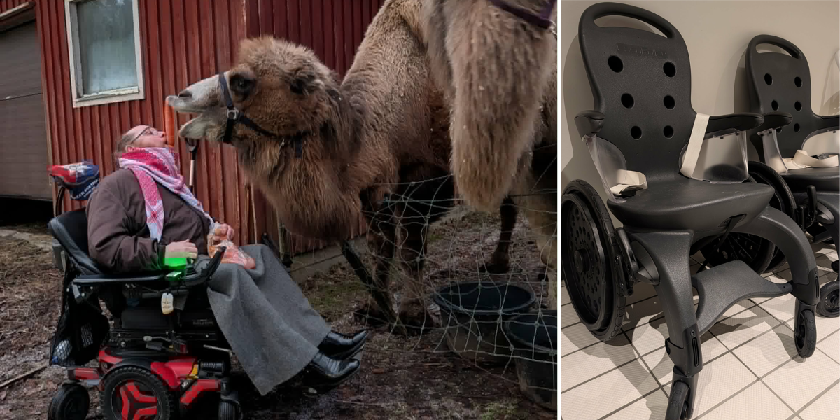 Sen har vi de som inte kan gå. En person i rullstol eller i en permobil med sex fjäderutrustade hjul och en sittdyna som är luftfylld, och till det så utrustad att den med lätthet blir en bår, aha! Eller en person som inte kan gå eller stå, och dessutom verkar ha ett skört och trasigt skelett. En sådan människa, för det är en människa vi pratar om, kan vi inte sätta i en duschstol eller i en transportstol under 2 till 4 eller 5 timmar beroende på besökslängd. Vi kan inte heller ha en duschstol utan uppfällbara armstöd eftersom människor som inte kan resa sig inte kan förflyttas på annat sätt än i sidled.