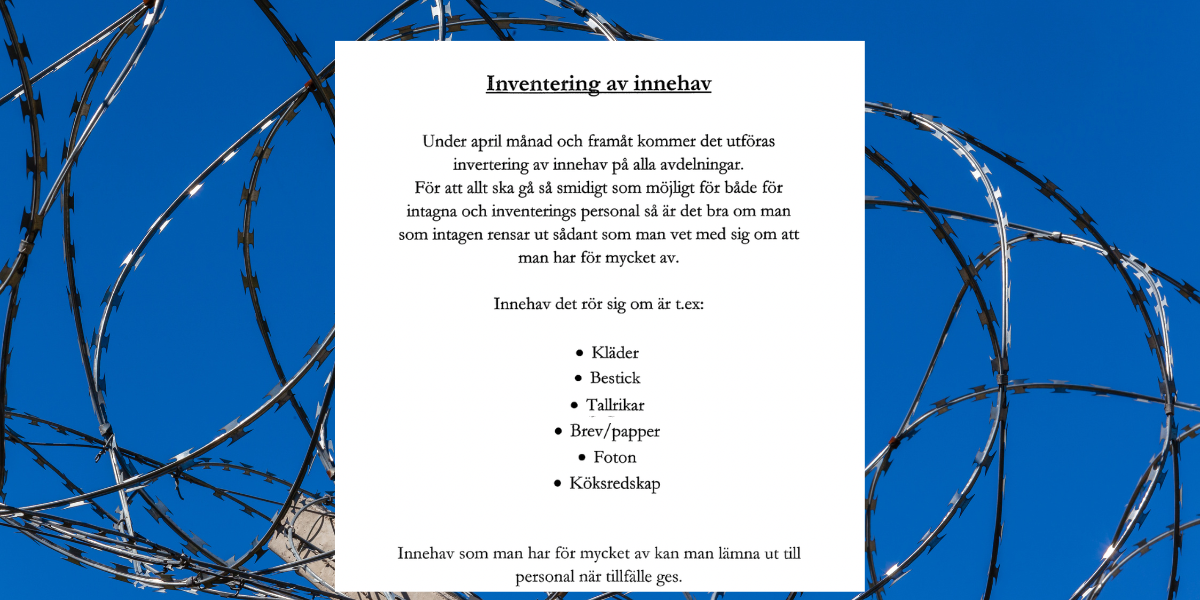 Under april månad är det inventering på Kumlaanstalten för innehav gällande bland annat brev och foton. Detta blir så otroligt dumt och leder till en massa diskussioner om vad som gäller.För att kunna följa reglerna måste vi intagna rimligen veta vad och hur mycket vi får ha i våra celler. Här uppstår dock ett problem, alla vakter säger olika och jag har i en tidigare krönika skrivit om detta problem när det gäller hygienartiklar. Där är det högst otydligt vad som gäller och Kriminalvårdens svar på mina hemställan gällande antalet var att det egentligen inte finns riktlinjer, utan att det varierar.